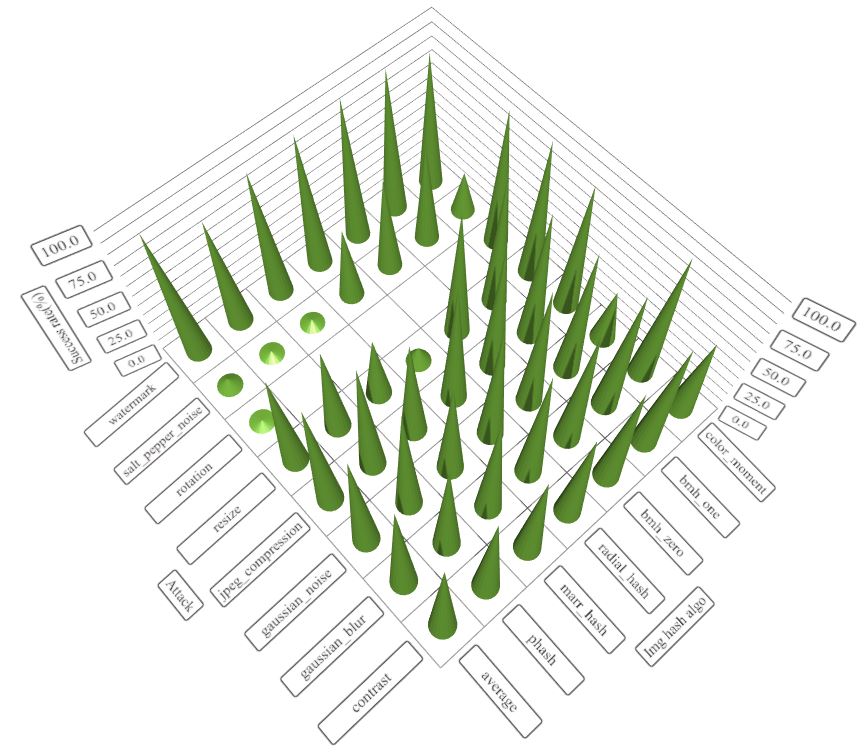 You can learn more about img_hash modules from following links, these links show you how to find similar image from ukbench dataset, provide thorough benchmark of different attacks(contrast, blur, noise(gaussion,pepper and salt), jpeg compression, watermark, resize).
