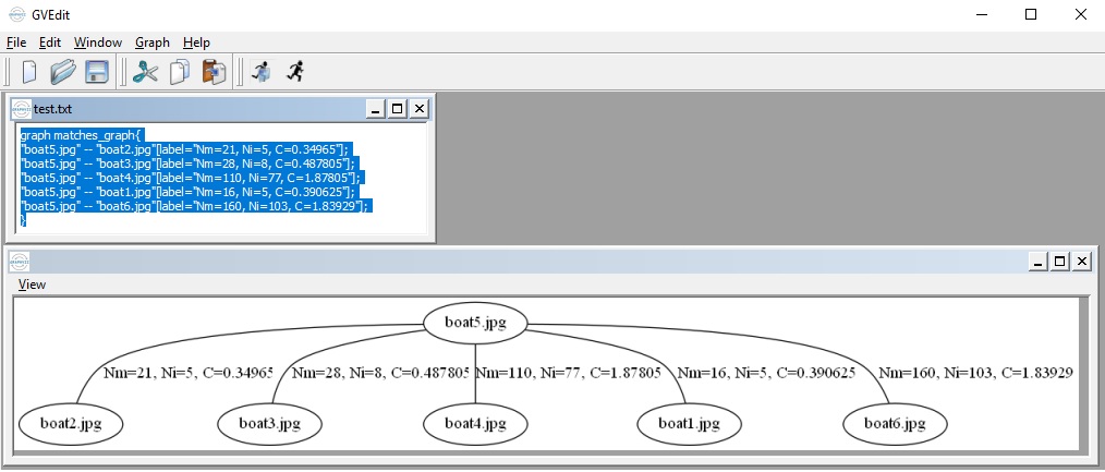 Save matches graph represented in DOT language to test.txt ( –save_graph test.txt) : Labels description: Nm is number of matches, Ni is number of inliers, C is confidence