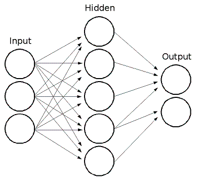 ML implements feed-forward artificial neural networks or, more particularly, multi-layer perceptrons (MLP), the most commonly used type of neural networks. MLP consists of the input layer, output layer, and one or more hidden layers. Each layer of MLP includes one or more neurons directionally linked with the neurons from the previous and the next layer. The example below represents a 3-layer perceptron with three inputs, two outputs, and the hidden layer including five neurons: