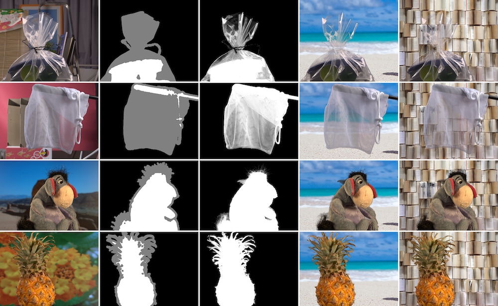 The first column is input RGB image, the second column is input trimap, third column is the extracted alpha matte and the last two columns show the foreground object blended on new backgrounds.