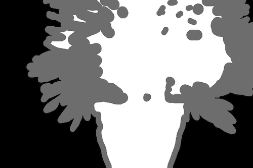 The trimap image is a greyscale image that contains information about the foreground(white pixels), background(black pixels) and unknown(grey) pixels.