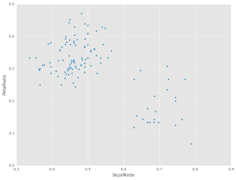 ...: .plot(kind='scatter', x='SepalRatio', y='PetalRatio'))
