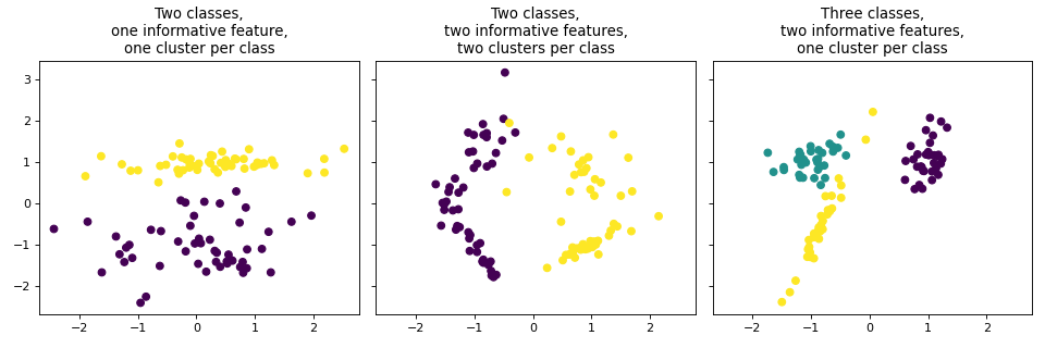 "Three classes,\ntwo informative features,\none cluster per class"]
