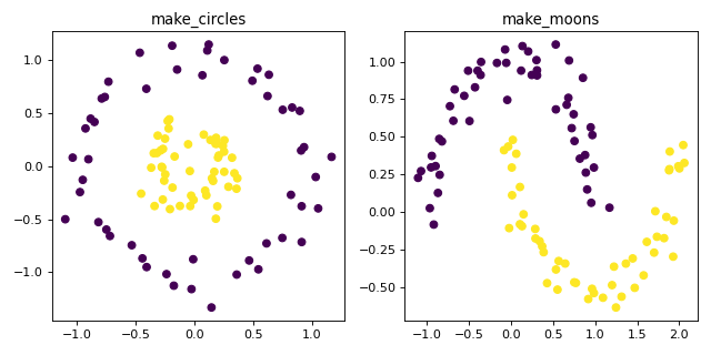 make_circles and make_moons generate 2D binary classification datasets that are challenging to certain algorithms (e.g., centroid-based clustering or linear classification), including optional Gaussian noise. They are useful for visualization. make_circles produces Gaussian data with a spherical decision boundary for binary classification, while make_moons produces two interleaving half-circles.
