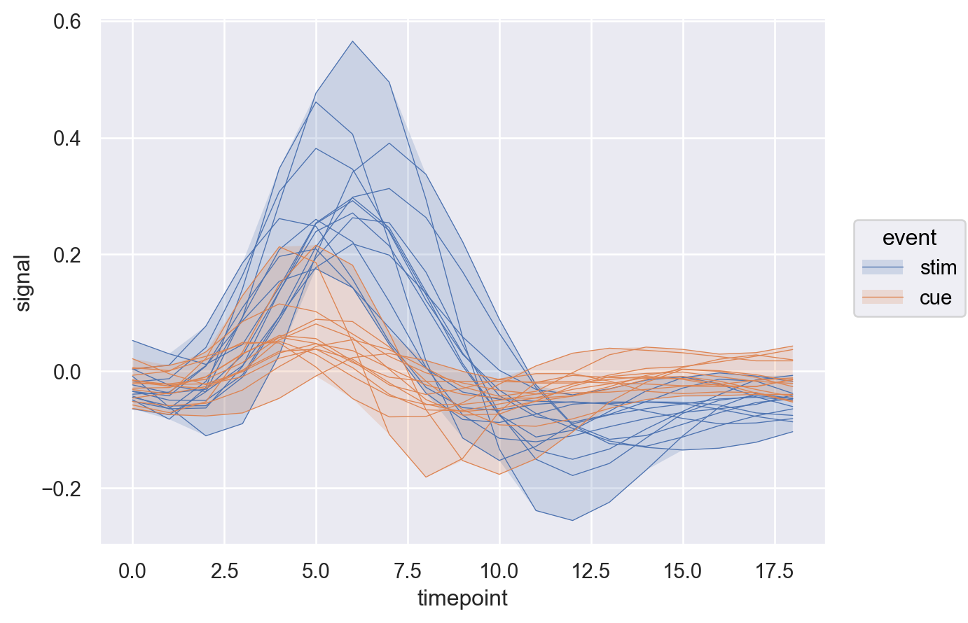 ( so.Plot(fmri, x="timepoint", y="signal", color="event") .add(so.Line(linewidth=.5), group="subject") .add(so.Band()) )
