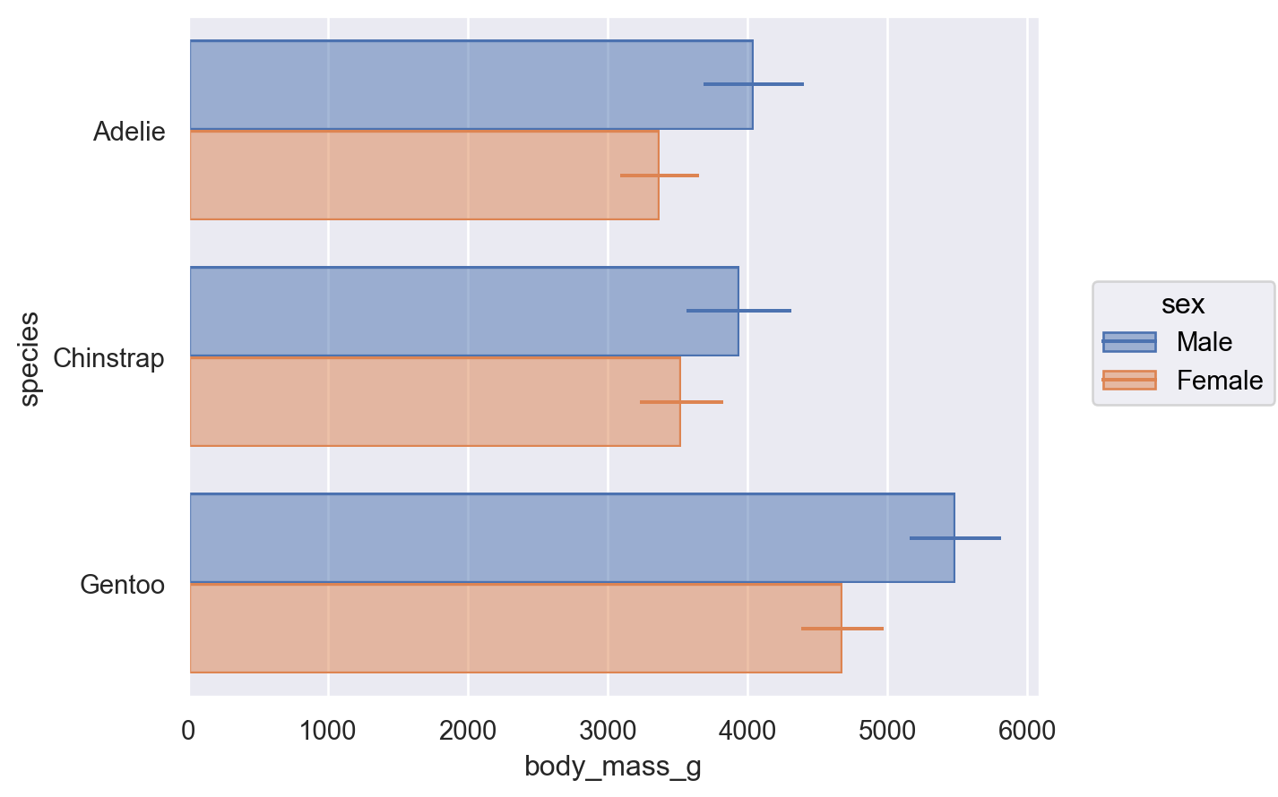 Rangeto plot an estimate with errorbars:( so.Plot(penguins, "body_mass_g", "species", color="sex") .add(so.Bar(alpha=.5), so.Agg(), so.Dodge()) .add(so.Range(), so.Est(errorbar="sd"), so.Dodge()) )