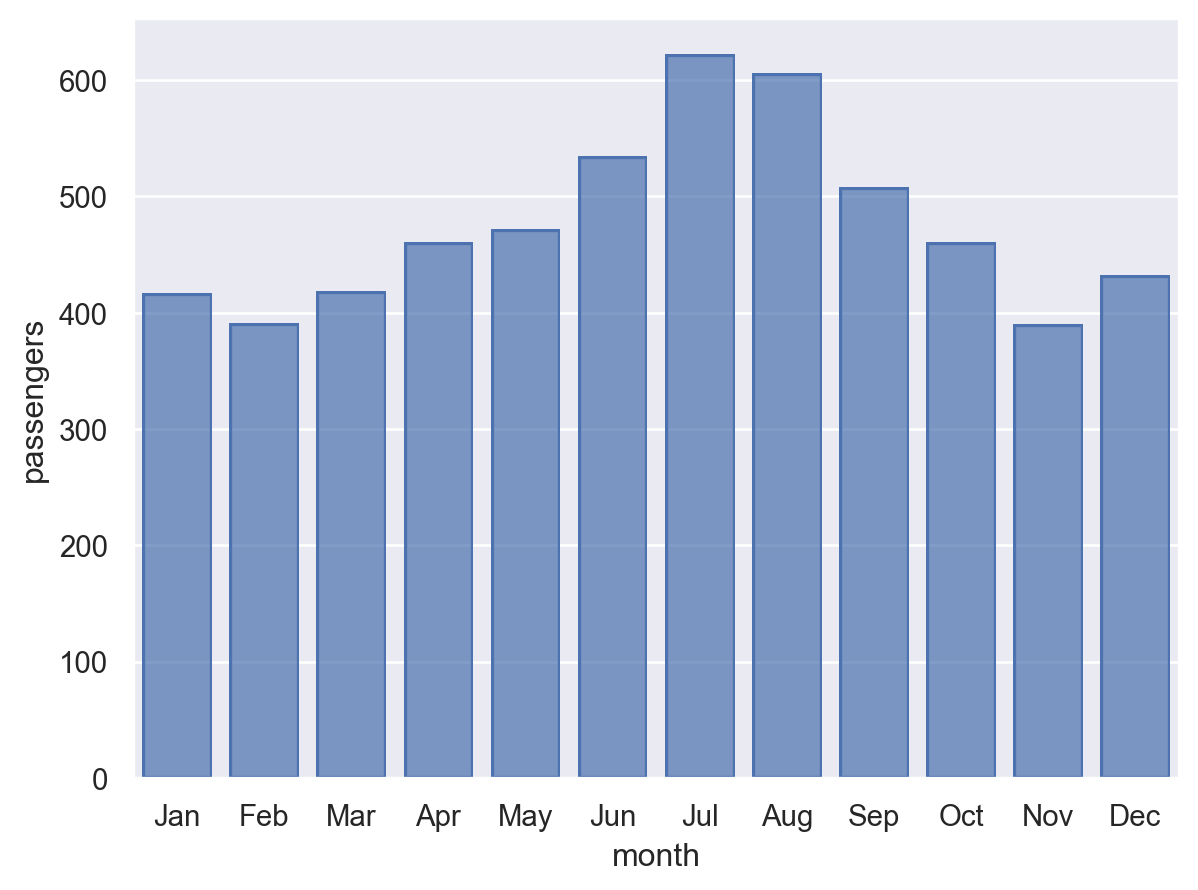 so.Plot(flights["month"], flights["passengers"]).add(so.Bar())