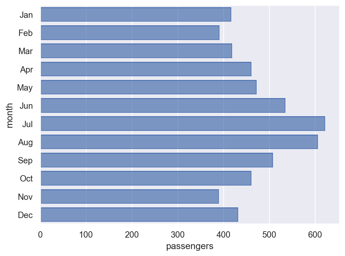 orientparameter:so.Plot(flights["passengers"], flights["month"]).add(so.Bar())