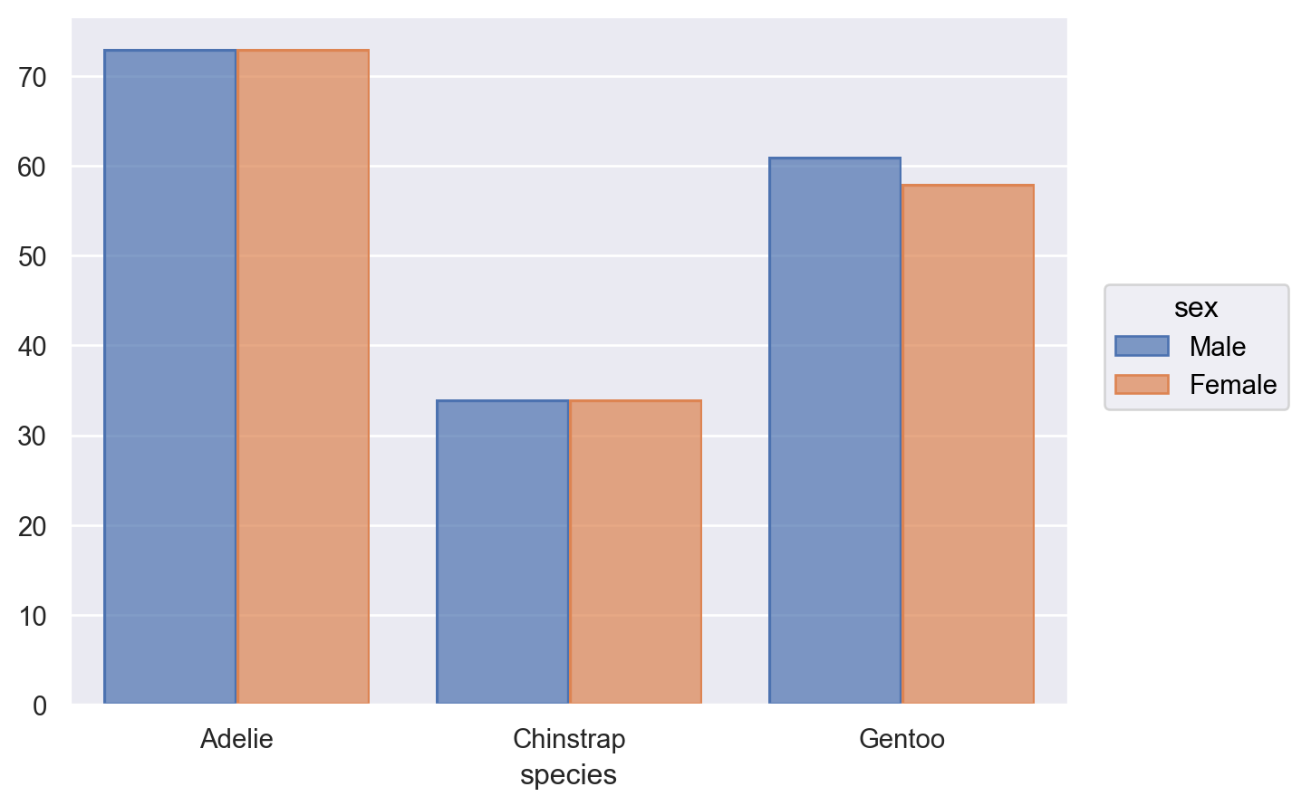 ( so.Plot( penguins, x="species", color="sex", alpha="sex", edgestyle="sex", ) .add(so.Bar(edgewidth=2), so.Hist(), so.Dodge("fill")) )