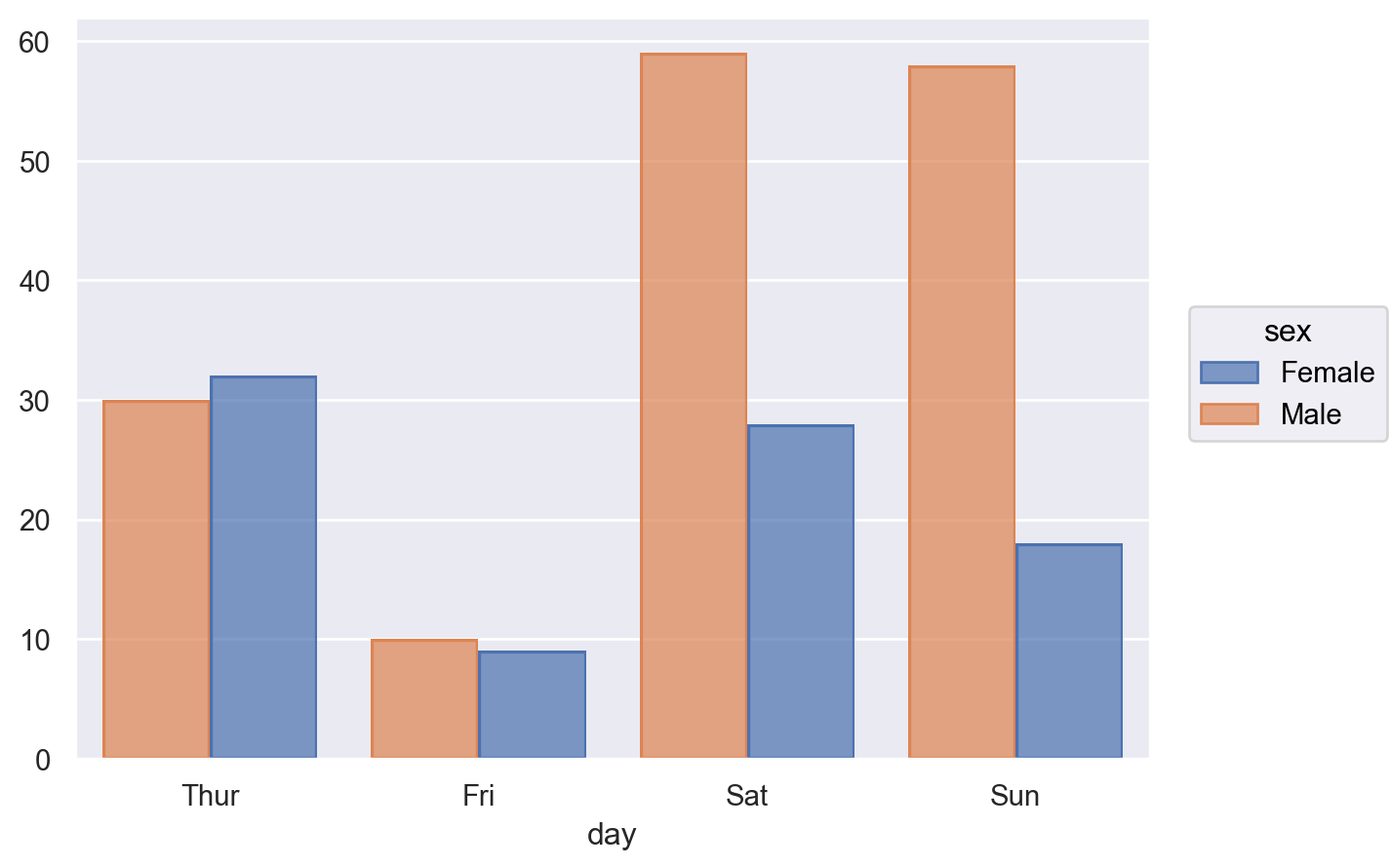 so.Plot(tips, x="day", color="sex").add(so.Bar(), so.Count(), so.Dodge())