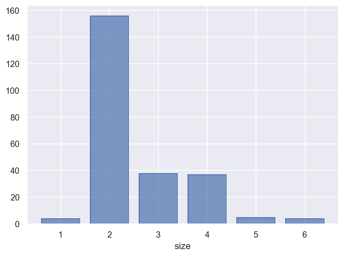 Hist, numeric data are not binned before counting:so.Plot(tips, x="size").add(so.Bar(), so.Count())
