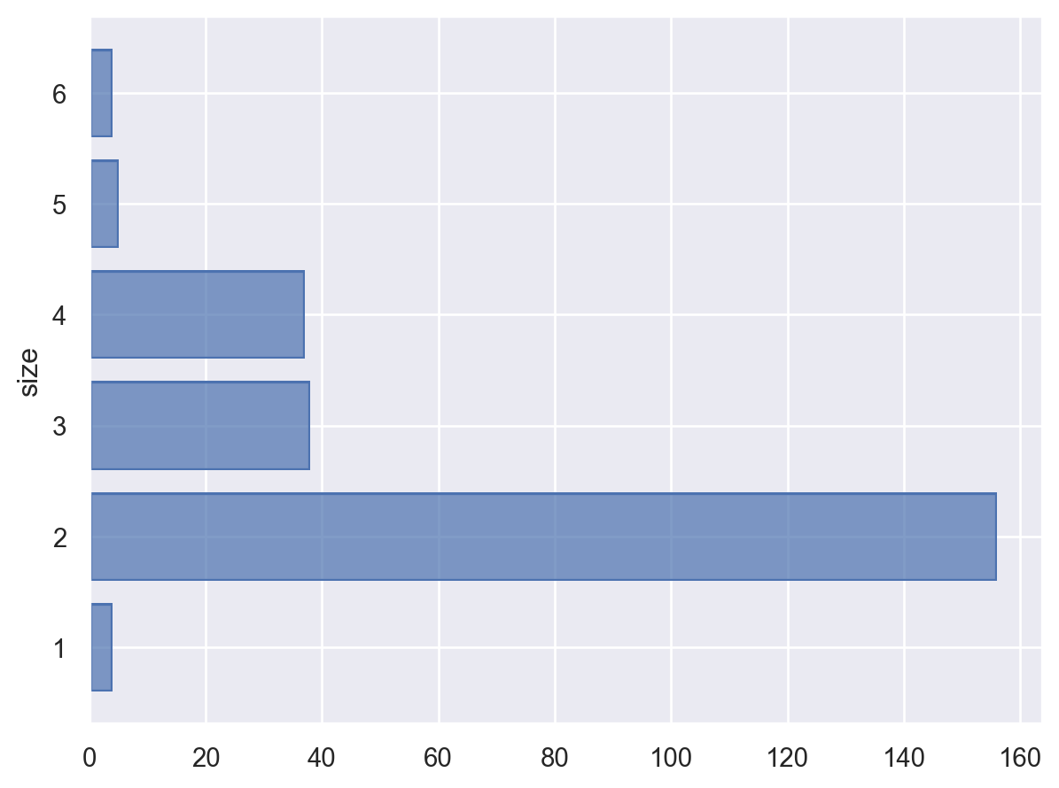 yvariable is defined, the counts are assigned to thexvariable:so.Plot(tips, y="size").add(so.Bar(), so.Count())
