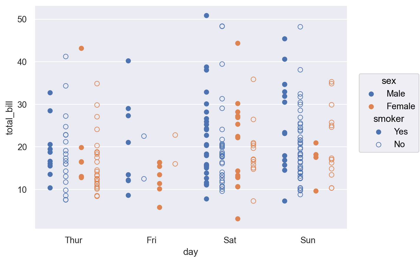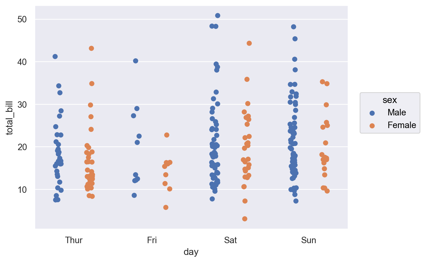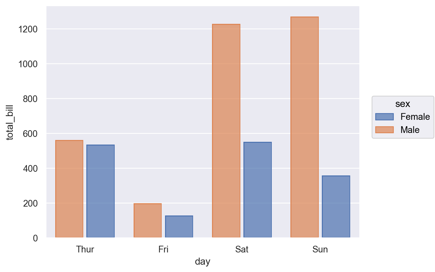 gapto add a bit of spacing between dodged marks:p = so.Plot(tips, "day", "total_bill", color="sex") p.add(so.Bar(), so.Agg("sum"), so.Dodge(gap=.1))