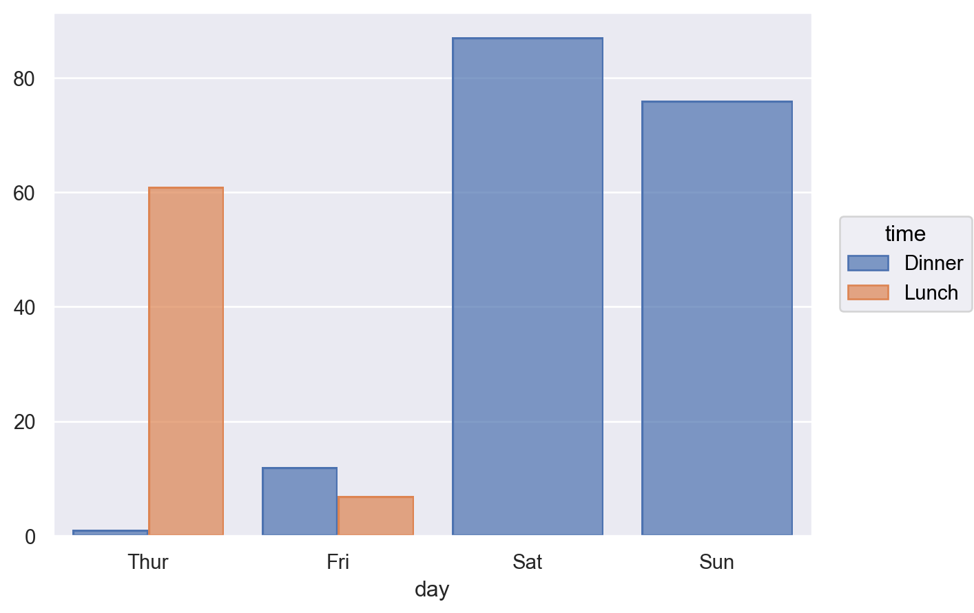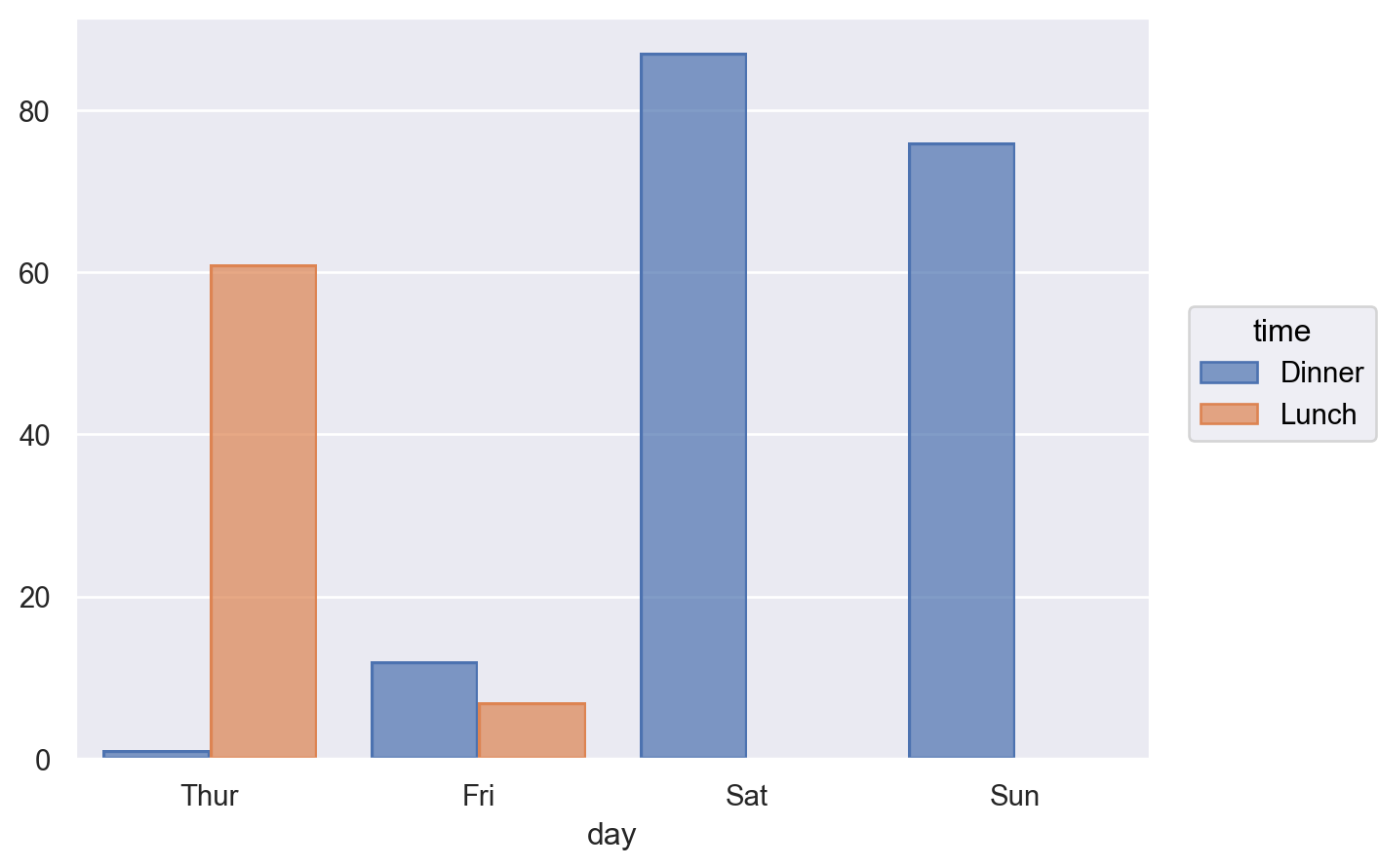 p = so.Plot(tips, "day", color="time") p.add(so.Bar(), so.Count(), so.Dodge())
