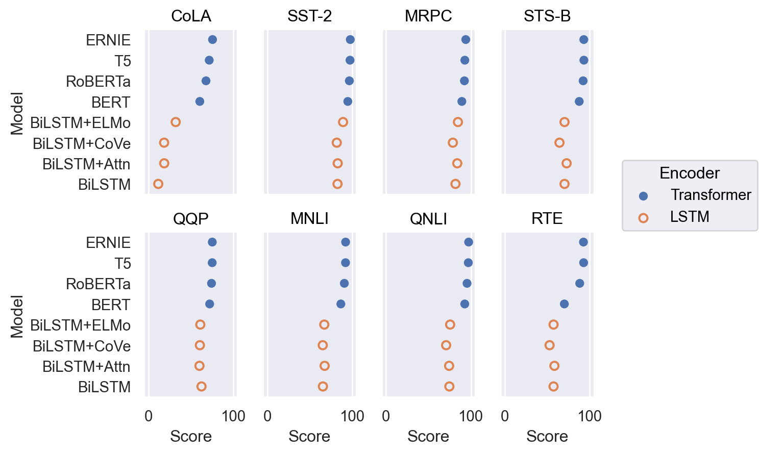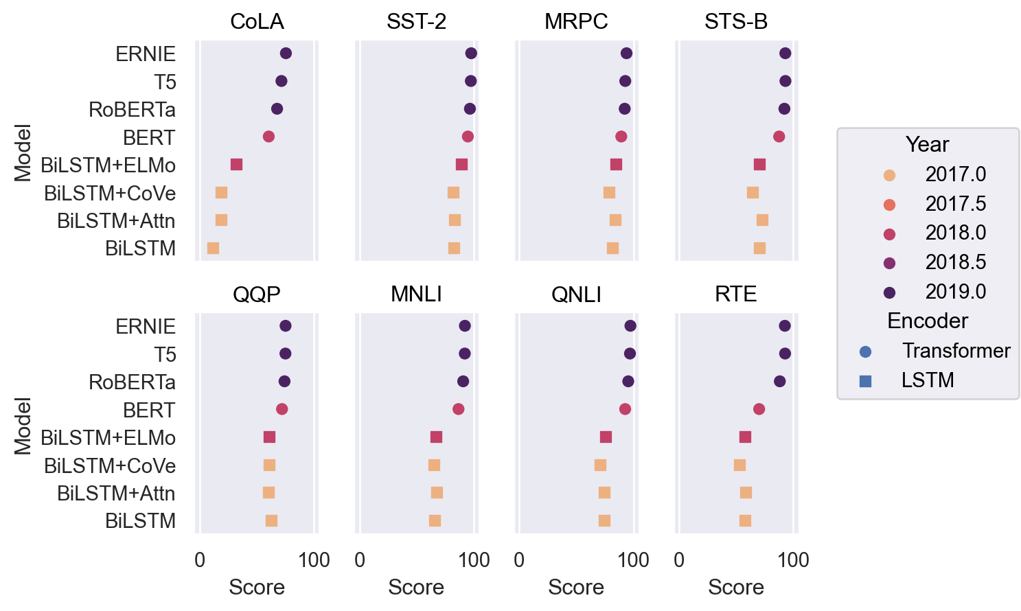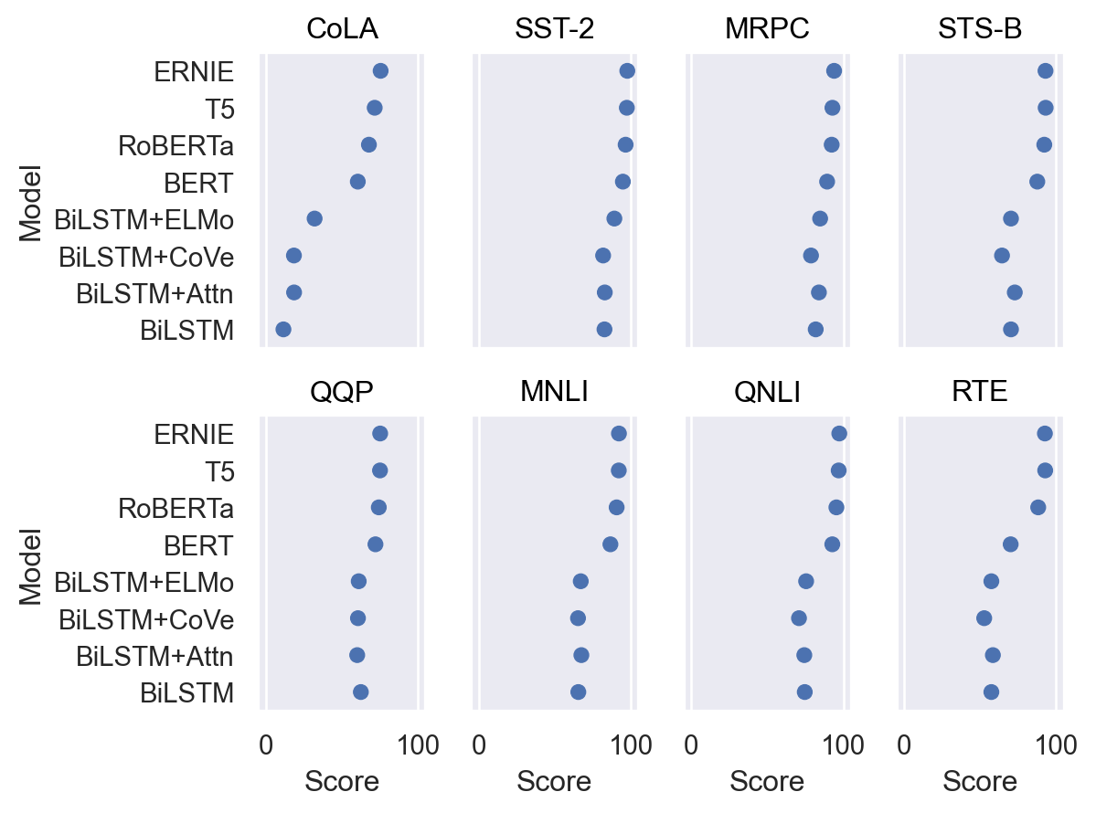 p2 = so.Plot(glue, "Score", "Model").facet("Task", wrap=4).limit(x=(-5, 105)) p2.add(so.Dot())