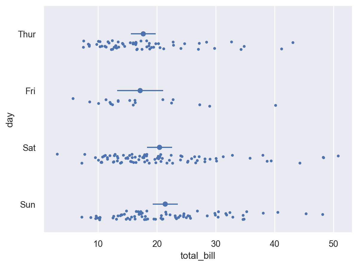Rangeto show error bars:( so.Plot(tips, x="total_bill", y="day") .add(so.Dot(pointsize=3), so.Shift(y=.2), so.Jitter(.2)) .add(so.Dot(), so.Agg()) .add(so.Range(), so.Est(errorbar=("se", 2))) )