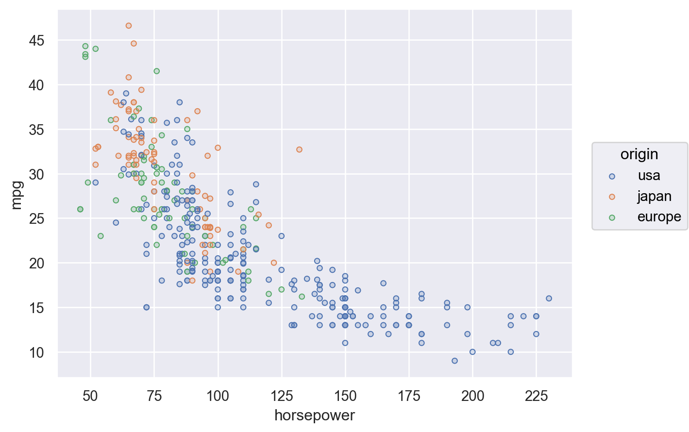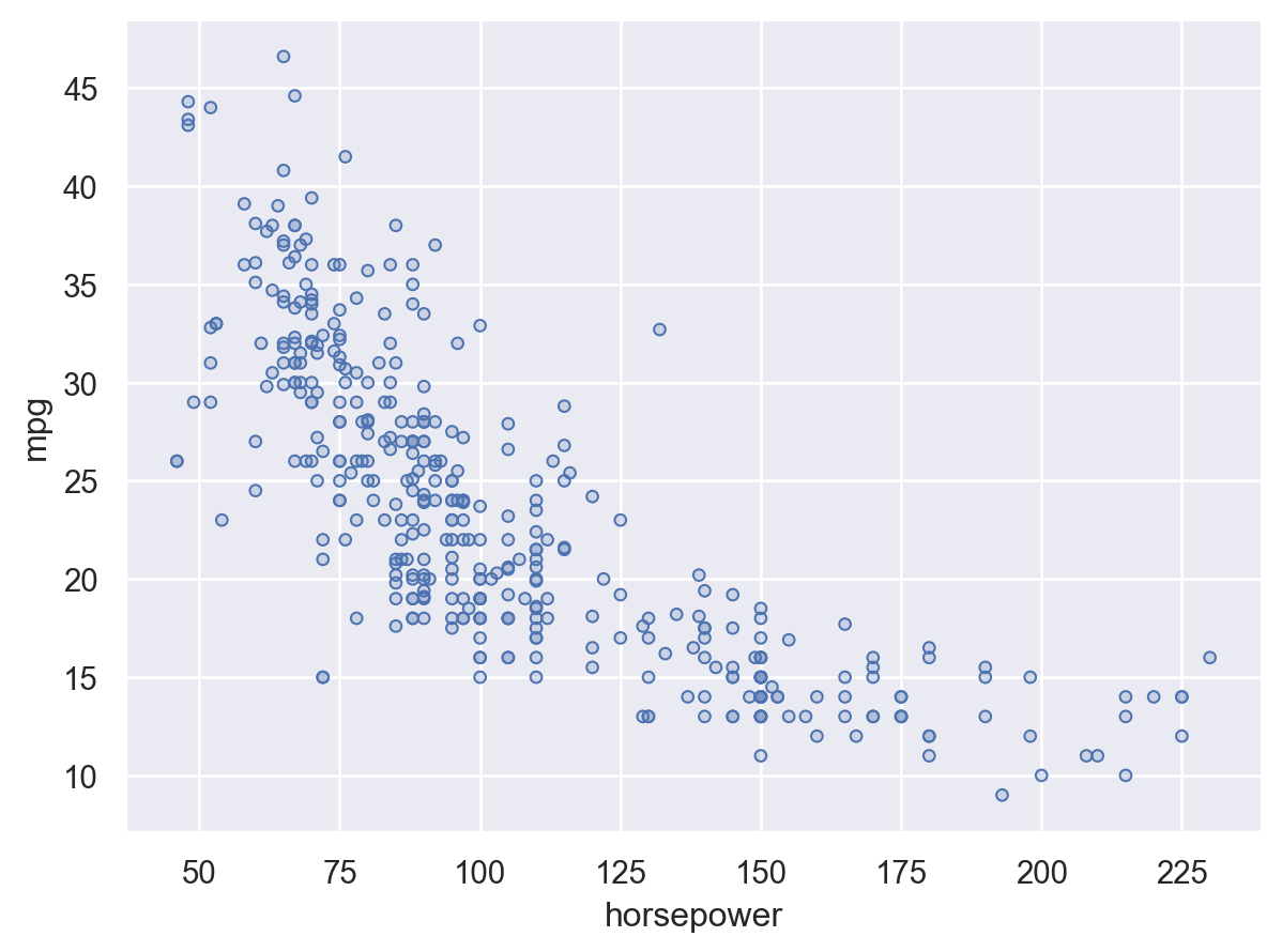 p1 = so.Plot(mpg, "horsepower", "mpg") p1.add(so.Dots())