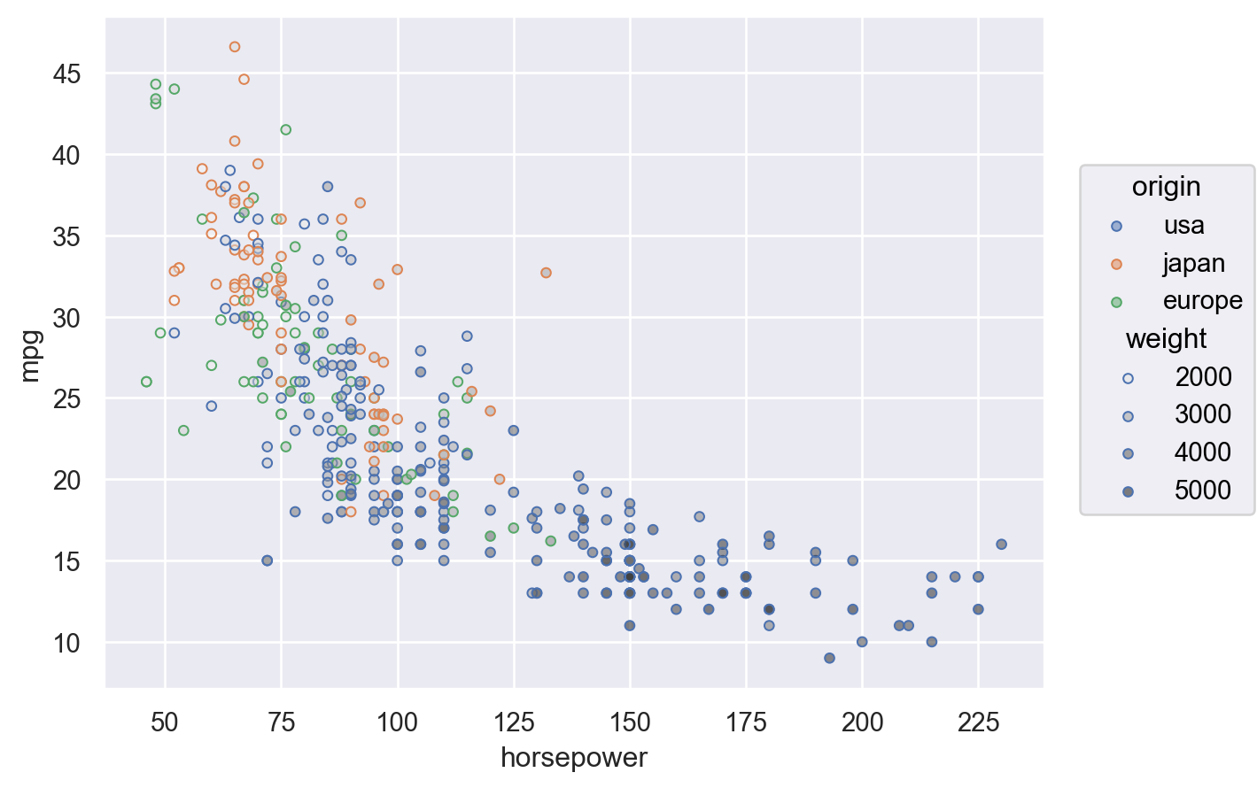 ( p1.add(so.Dots(fillalpha=.5), color="origin", fillcolor="weight") .scale(fillcolor="binary") )