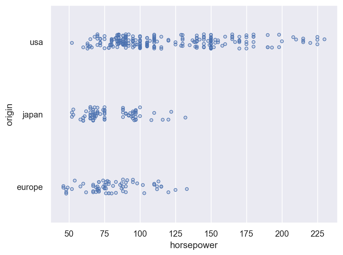 ( so.Plot(mpg, "horsepower", "origin") .add(so.Dots(), so.Jitter(.25)) )