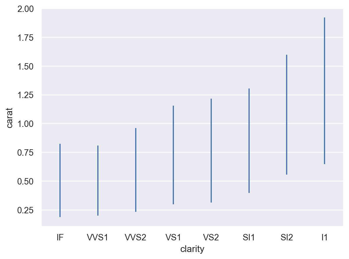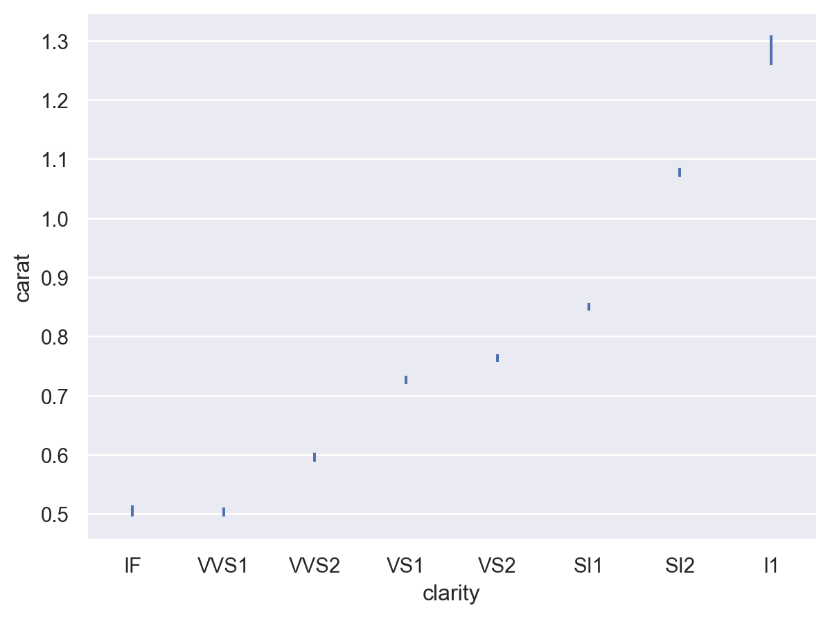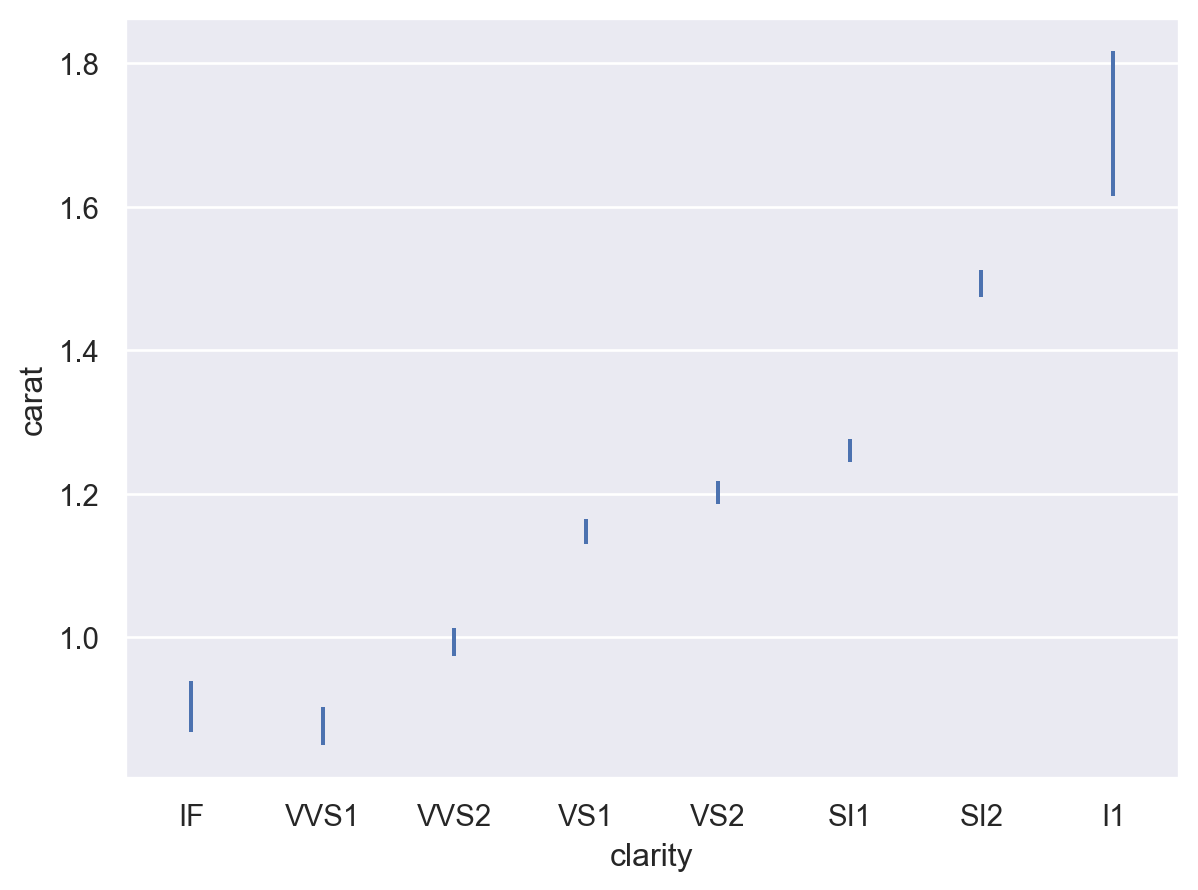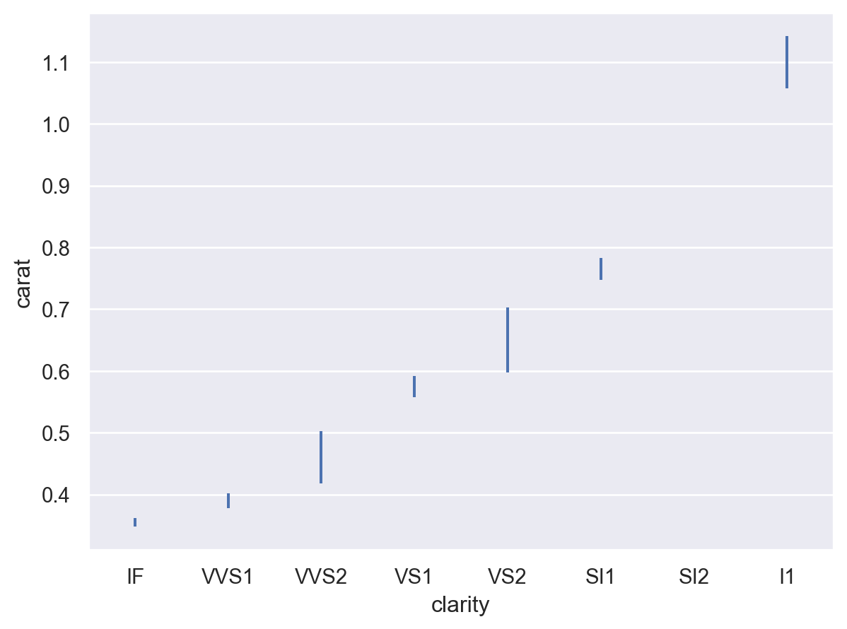 p = so.Plot(diamonds, "clarity", "carat") p.add(so.Range(), so.Est())