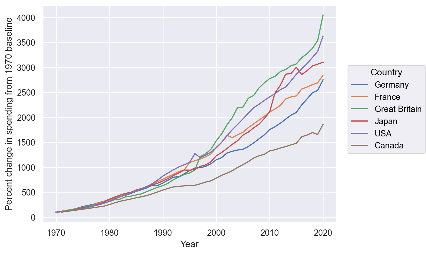 whereto constrain the values used to define a baseline, andpercentto scale the output:( so.Plot(healthexp, x="Year", y="Spending_USD", color="Country") .add(so.Lines(), so.Norm(where="x == x.min()", percent=True)) .label(y="Percent change in spending from 1970 baseline") )
