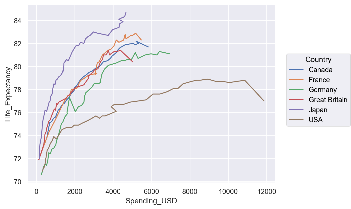 Line, this mark does not sort observations before plotting, making it suitable for plotting trajectories through a variable space:p = so.Plot(healthexp, "Spending_USD", "Life_Expectancy", color="Country") p.add(so.Path())