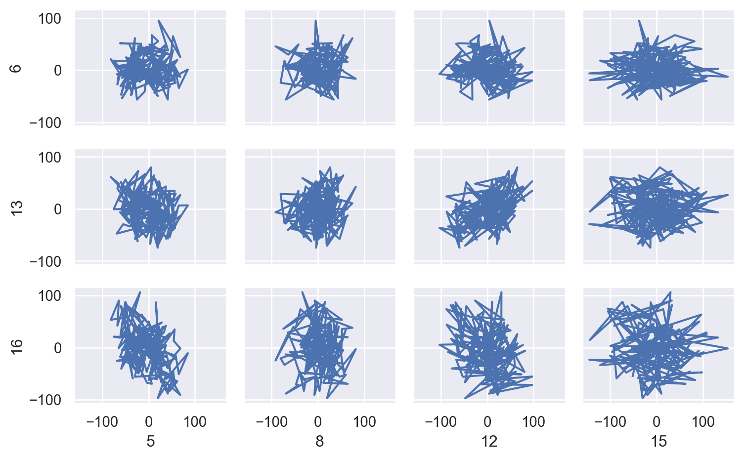 Lines, this mark does not sort observations before plotting, making it suitable for plotting trajectories through a variable space:p = ( so.Plot(networks) .pair( x=["5", "8", "12", "15"], y=["6", "13", "16"], ) .layout(size=(8, 5)) .share(x=True, y=True) ) p.add(so.Paths())