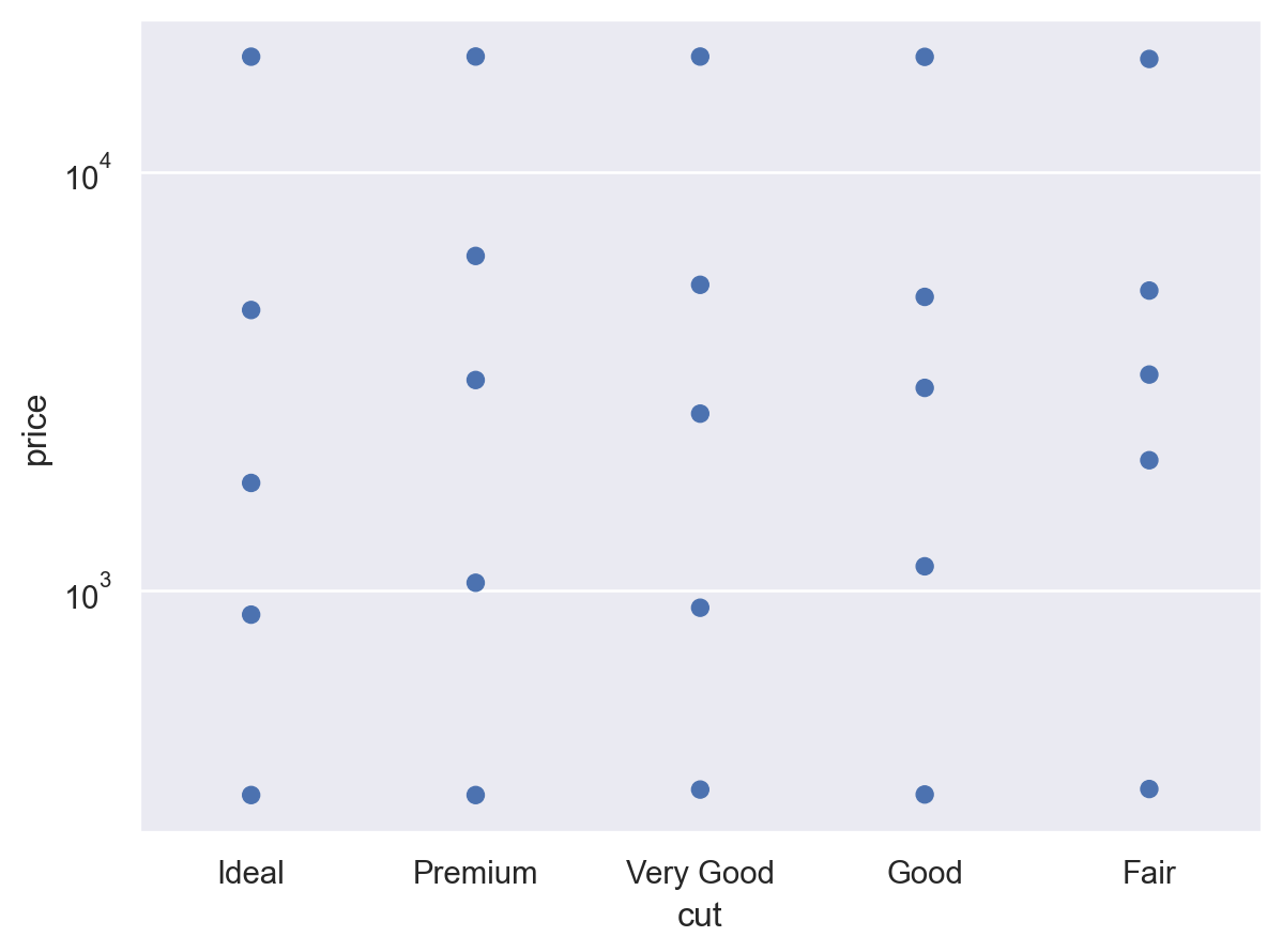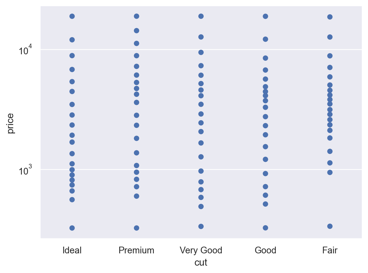 p = ( so.Plot(diamonds, "cut", "price") .scale(y="log") ) p.add(so.Dot(), so.Perc())