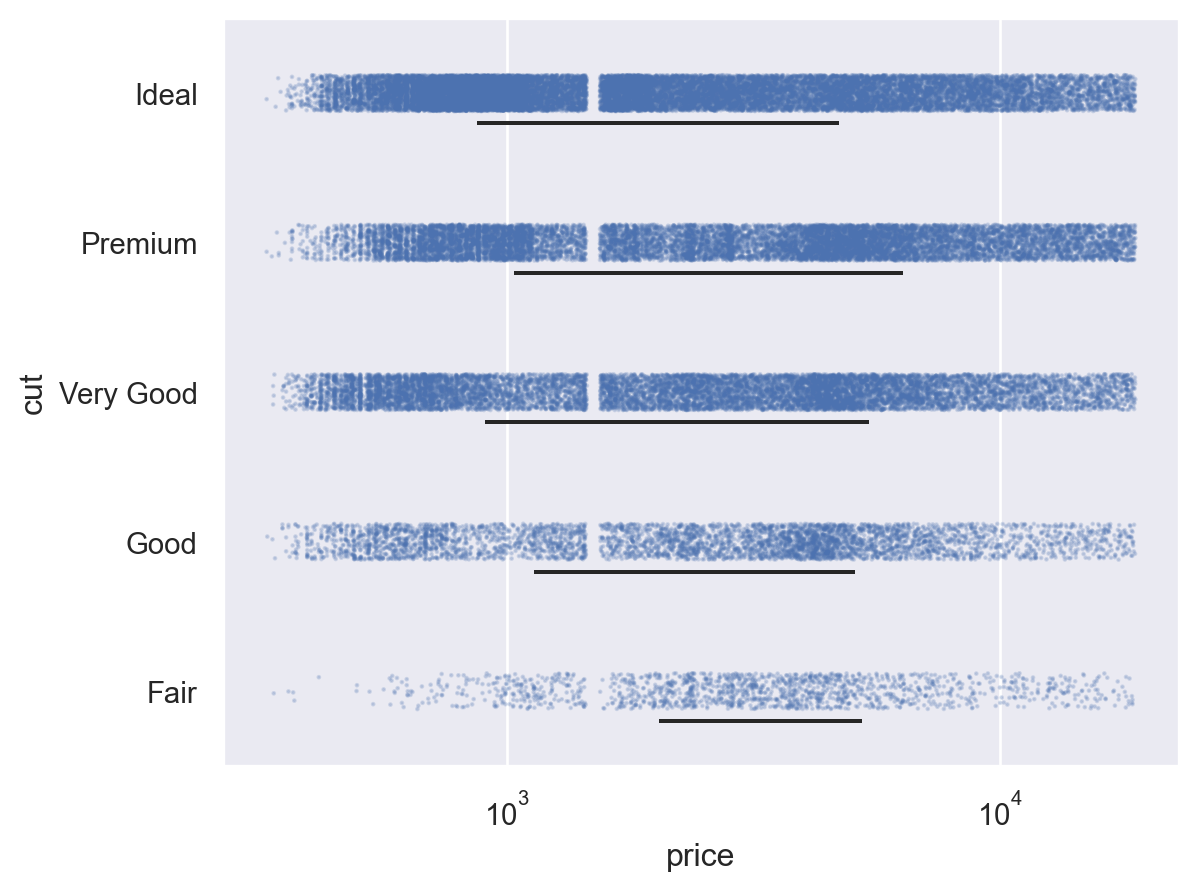 ( so.Plot(diamonds, "price", "cut") .add(so.Dots(pointsize=1, alpha=.2), so.Jitter(.3)) .add(so.Range(color="k"), so.Perc([25, 75]), so.Shift(y=.2)) .scale(x="log") )