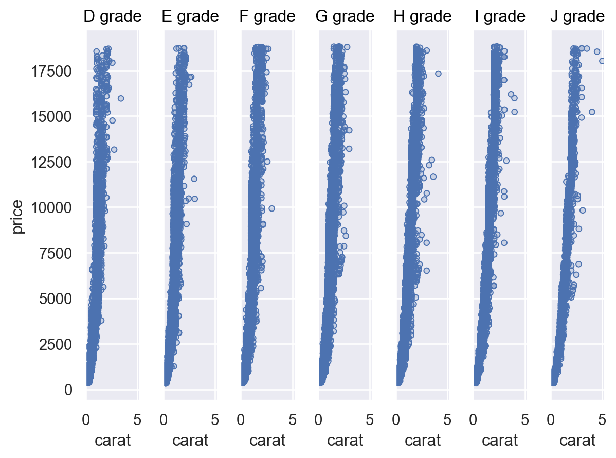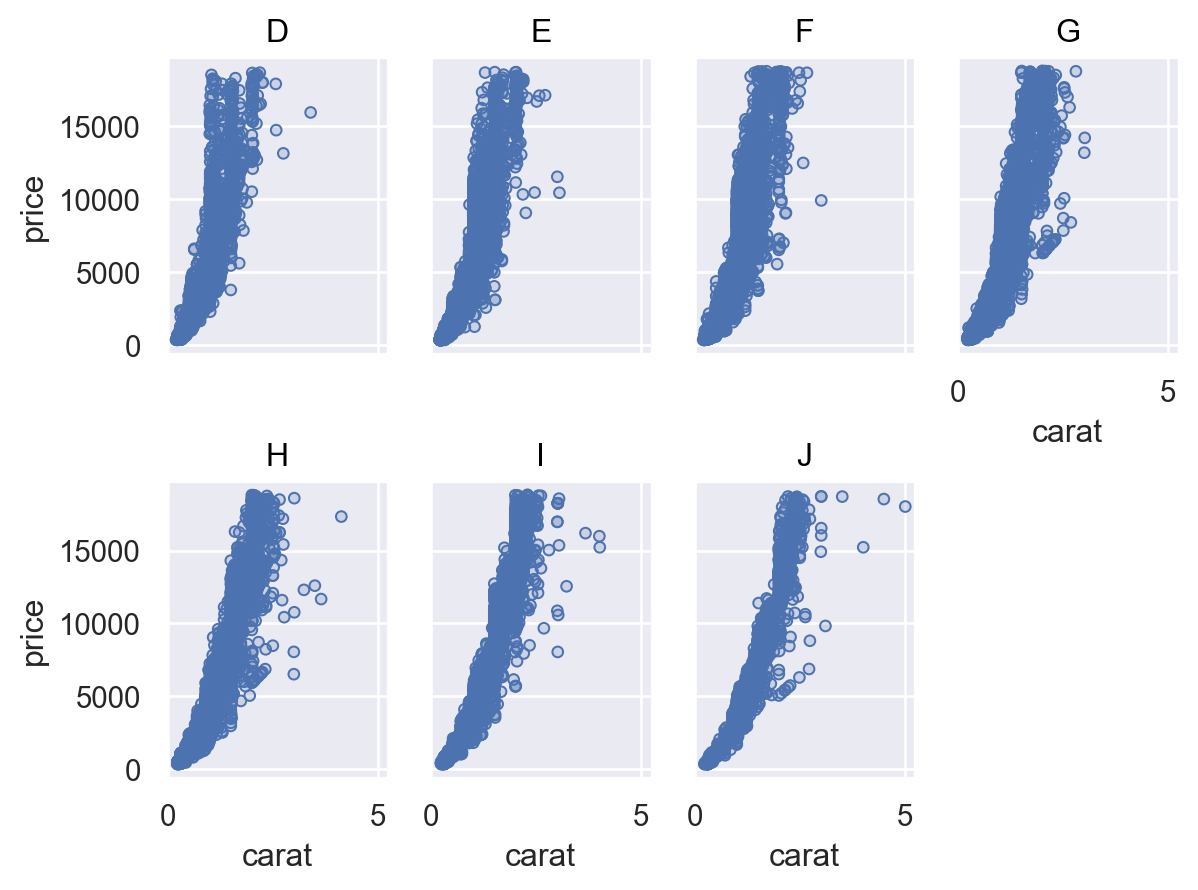 wrapit to distribute subplots across both dimensions:p = so.Plot(diamonds, x="carat", y="price").add(so.Dots()) p.facet("color", wrap=4)