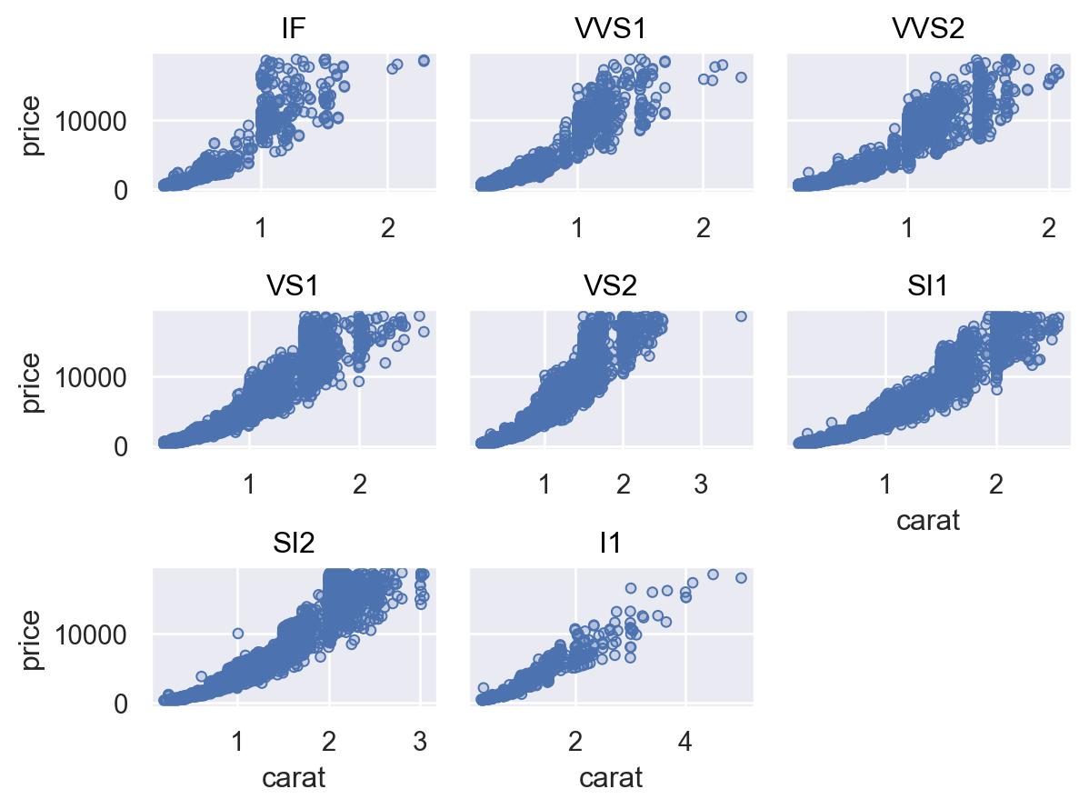 Plot.share()to specify whether facets should be scaled the same way:p.facet("clarity", wrap=3).share(x=False)