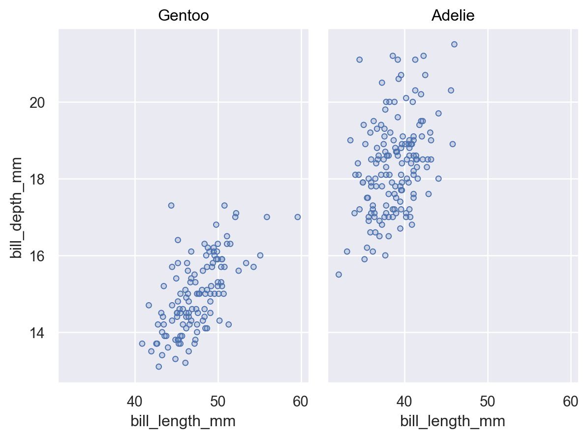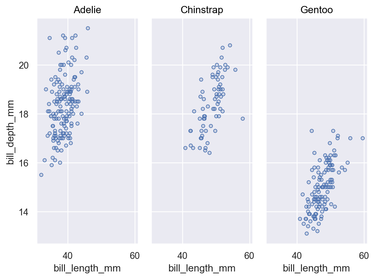 p = so.Plot(penguins, "bill_length_mm", "bill_depth_mm").add(so.Dots()) p.facet("species")