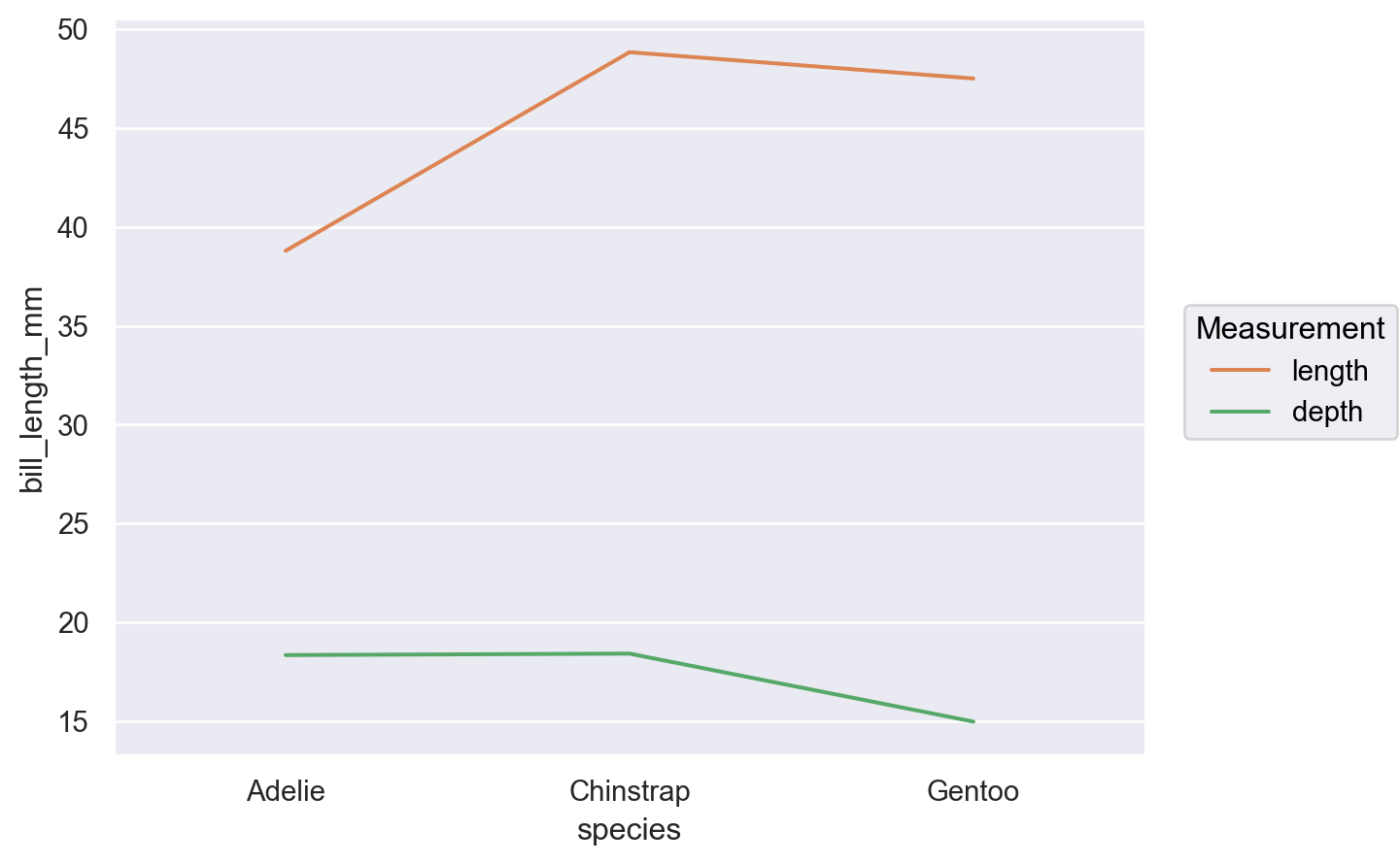 legend=parameter sets the title for the legend:( so.Plot(penguins, x="species") .add(so.Line(color="C1"), so.Agg(), y="bill_length_mm", label="length") .add(so.Line(color="C2"), so.Agg(), y="bill_depth_mm", label="depth") .label(legend="Measurement") )