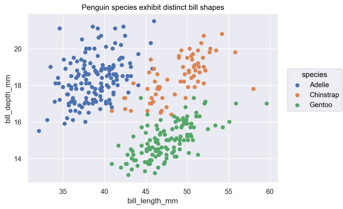 p.label(title="Penguin species exhibit distinct bill shapes")