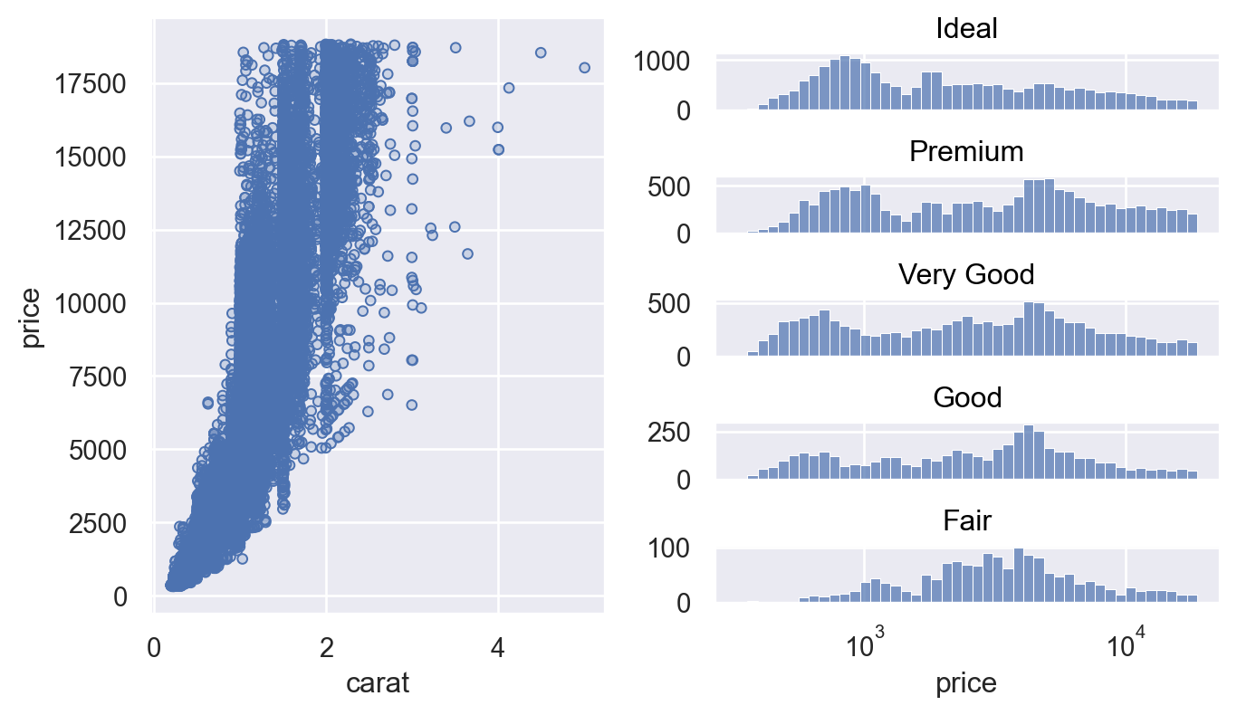 matplotlib.figure.Figure.subfigures(), which make it easier to composite multiple arrangements of subplots. These can also be passed toPlot.on(),f = mpl.figure.Figure(figsize=(7, 4), dpi=100, layout="constrained") sf1, sf2 = f.subfigures(1, 2) p.on(sf1).plot() ( so.Plot(diamonds, x="price") .add(so.Bars(), so.Hist()) .facet(row="cut") .scale(x="log") .share(y=False) .on(sf2) )