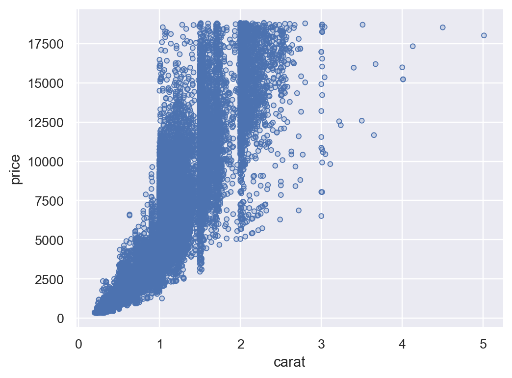 matplotlib.axes.Axesobject provides functionality closest to seaborn’s axes-level plotting functions. Notice how the resulting image looks different from others created withPlot. This is because the plot theme uses the global rcParams at the time the axes were created, rather thanPlotdefaults:p = so.Plot(diamonds, "carat", "price").add(so.Dots()) f, ax = plt.subplots() p.on(ax).show()