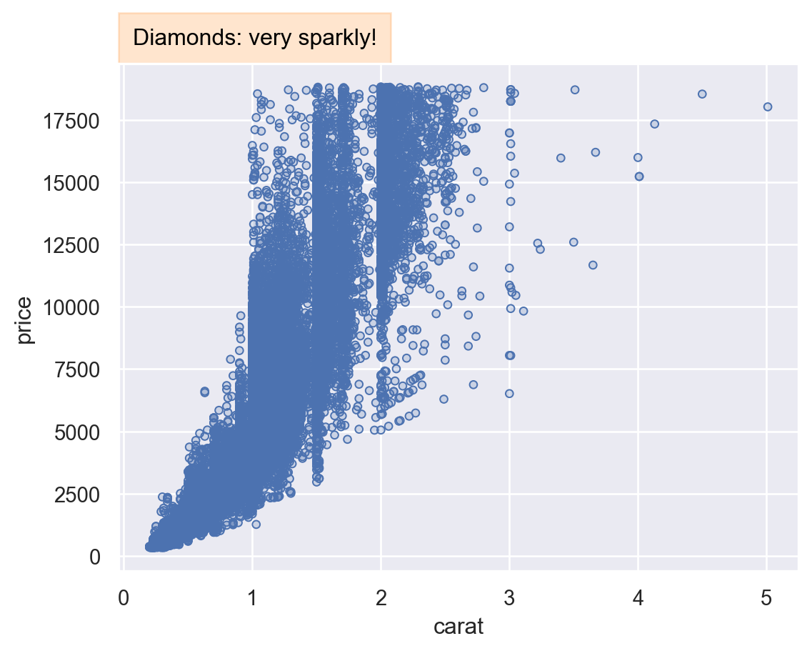 Plot.onalso provides access to the underlying matplotlib objects, which may be useful for deep customization. But it requires a careful attention to the order of operations by which thePlotis specified, compiled, customized, and displayed:f = mpl.figure.Figure() res = p.on(f).plot() ax = f.axes[0] rect = mpl.patches.Rectangle( xy=(0, 1), width=.4, height=.1, color="C1", alpha=.2, transform=ax.transAxes, clip_on=False, ) ax.add_artist(rect) ax.text( x=rect.get_width() / 2, y=1 + rect.get_height() / 2, s="Diamonds: very sparkly!", size=12, ha="center", va="center", transform=ax.transAxes, ) res