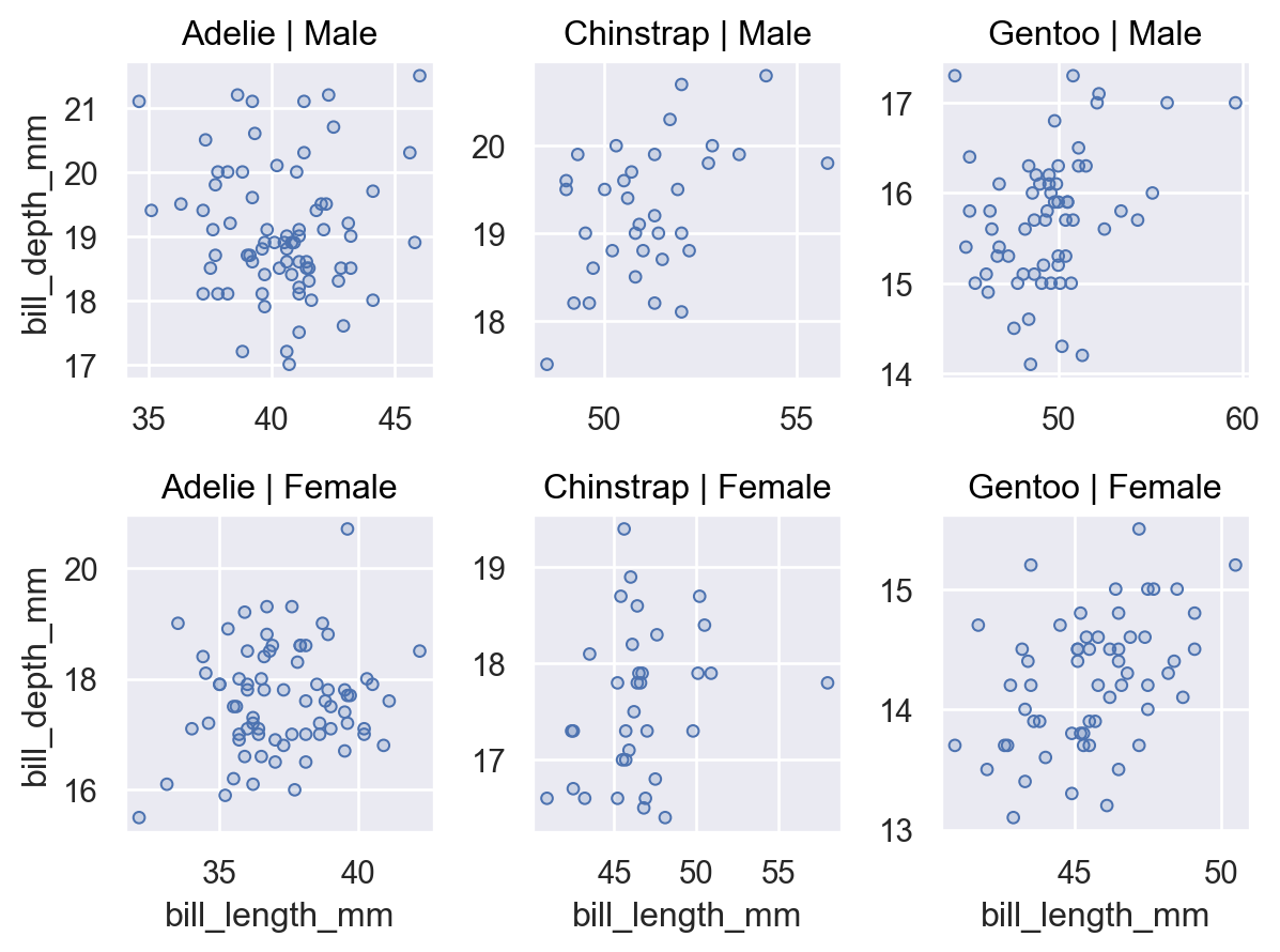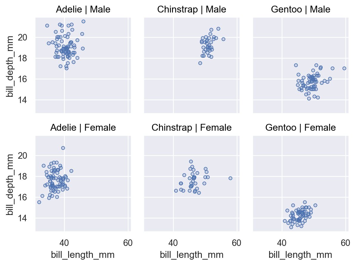 p = ( so.Plot(penguins, x="bill_length_mm", y="bill_depth_mm") .facet(col="species", row="sex") .add(so.Dots()) ) p