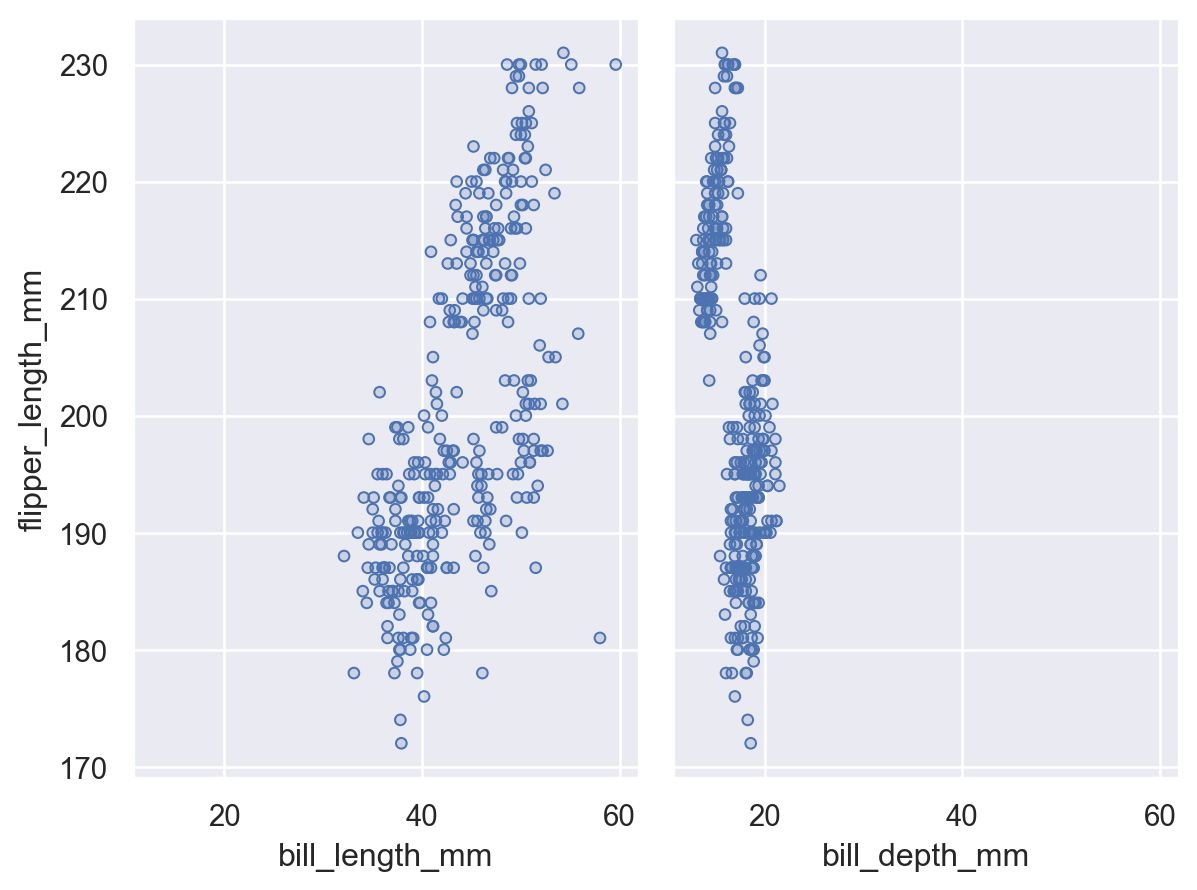 ( so.Plot(penguins, y="flipper_length_mm") .pair(x=["bill_length_mm", "bill_depth_mm"]) .add(so.Dots()) .share(x=True) )