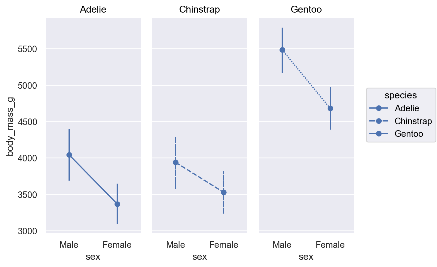 linestyleandlinewidth; exclude those properties from the relevant layer if this behavior is undesired:( so.Plot(penguins, x="sex", y="body_mass_g", linestyle="species") .facet("species") .add(so.Line(marker="o"), so.Agg()) .add(so.Range(), so.Est(errorbar="sd")) )