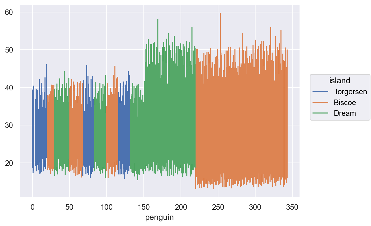 ( penguins .rename_axis(index="penguin") .pipe(so.Plot, x="penguin", ymin="bill_depth_mm", ymax="bill_length_mm") .add(so.Range(), color="island") )